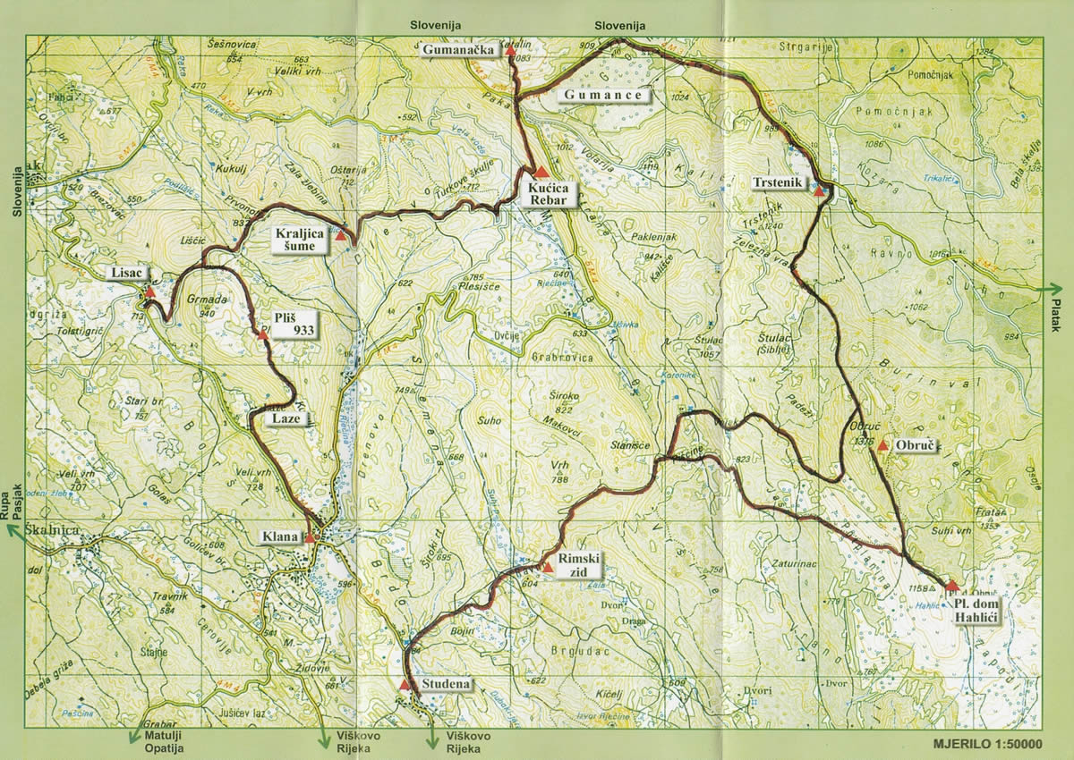 From the paved road to Klana, turn right onto a forest path passing through the Ravno clearing, where you’ll find remains of the Roman wall. Continue onward to Obruč (1377 m).